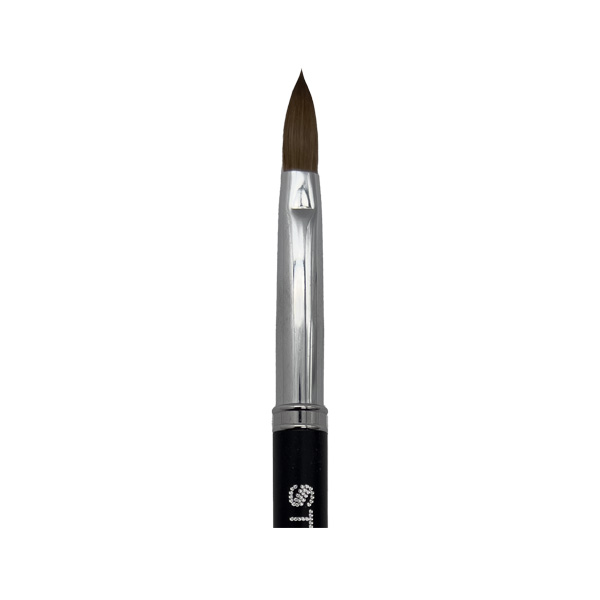 Fabricado con pelo 100% Kolinsky, este pincel garantiza una óptima absorción de monómero, logrando una mejor fluidez del acrílico sin residuos indeseados. Su diseño combina una virola metálica plateada con un mango negro mate elegante, personalizado con el nombre de la firma e inspirado en el efecto de diamantes.